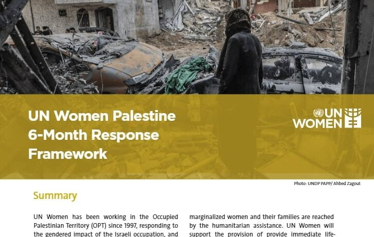 Following the escalation of hostilities after the 7 October 2023 Hamas attack on Israel, UN Women is responding in line with its humanitarian strategy, its long-standing work in Palestine on humanitarian assistance and women, peace, and security, and the UN and partner Flash Appeal launched on 6 November 2023. This document articulates UN Women’s 6-month plan to respond to the needs across the Occupied Palestinian Territory, while reflecting the distinct and rapidly evolving realities on the ground in Gaza and the West Bank, including East Jerusalem.